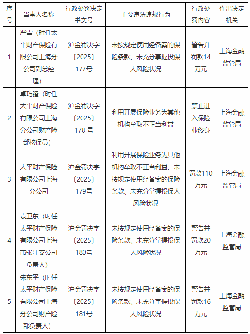 中国经济网北京11月1日电 据国家金融监管总局上海监管局昨日发布的《行政处罚信息公示表》(沪金丰决字[2025]177-181号)显示,太平财产保险股份有限公司上海分公司的主要违法行为是利用保险业务从其他机构获取不正当利益、未按照规定使用登记的保险条件、未充分了解被保险人的风险状况等。上海市金融监督管理局对其处以罚款110万元。涉事三名责任人受到警告、罚款共计50万元,另一人被永久禁止进入保险行业。先生。严雪(时任太平财产保险股份有限公司上海分公司副总经理)因未按照必要使用登记的保险条件、未充分了解被保险人的风险状况,被上海市金融监管局给予警告,并处以14万元罚款。卓巧峰(时任太平财产保险股份有限公司上海分公司非寿险部保险人)因利用保险业务为其他机构谋取不正当利益,被上海市金融监管局永久禁止进入保险业。袁卫东先生(时任太平财产保险股份有限公司上海张江分公司经理)因未按要求使用登记的保险条件、未充分了解被保险人的风险情况,被上海金融机构监察室给予警告,并处以20万元罚款。朱东平先生(时任非盟总经理)(太平财产保险股份有限公司上海分公司寿险部)因未按要求使用登记的保险条件、未充分了解被保险人的风险情况,被上海市金融监管局警告并罚款16万元。处罚原文如下: