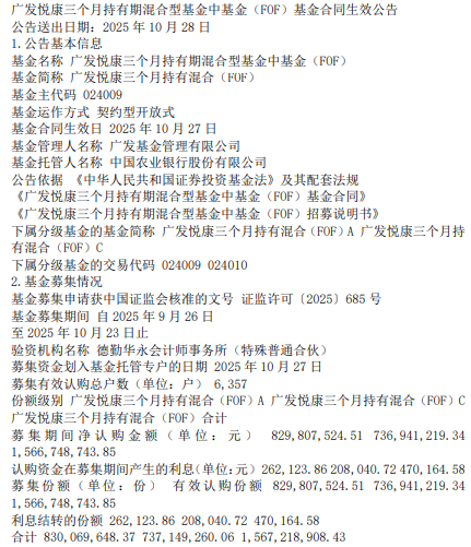 中国经济网北京10月28日电 广发基金今日宣布广发悦康混合型母基金(FOF)基金合同生效,持有期限为三个月。融资期间认购净额为1,566,748,743.85元,融资期间认购资金应计利息为470,164.58元,募集股份总数为1,567,218,908.43元。基金经理宋佳吉于2014年6月27日至2019年9月9日在海通证券研究所担任基金研究分析师。2019年9月12日至2020年8月4日在方正证券股份有限公司研究中心担任基金研究分析师。 2020年8月7日至2021年8月17日在财富管理部担任基金投资顾问、投资经理申万宏源证券股份有限公司董事。2021年8月23日加入广发基金管理有限公司,在投资配置部担任基金研究员、投资顾问投资经理。资产。