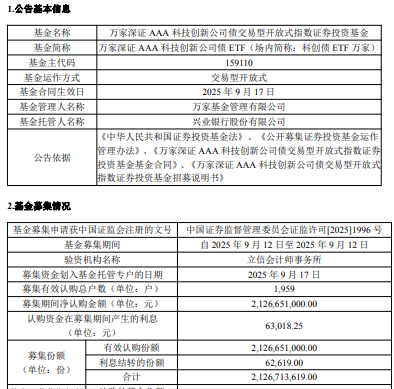 Wanjia深圳AAA技术创新债券ETF证书的规模为21亿元人民币